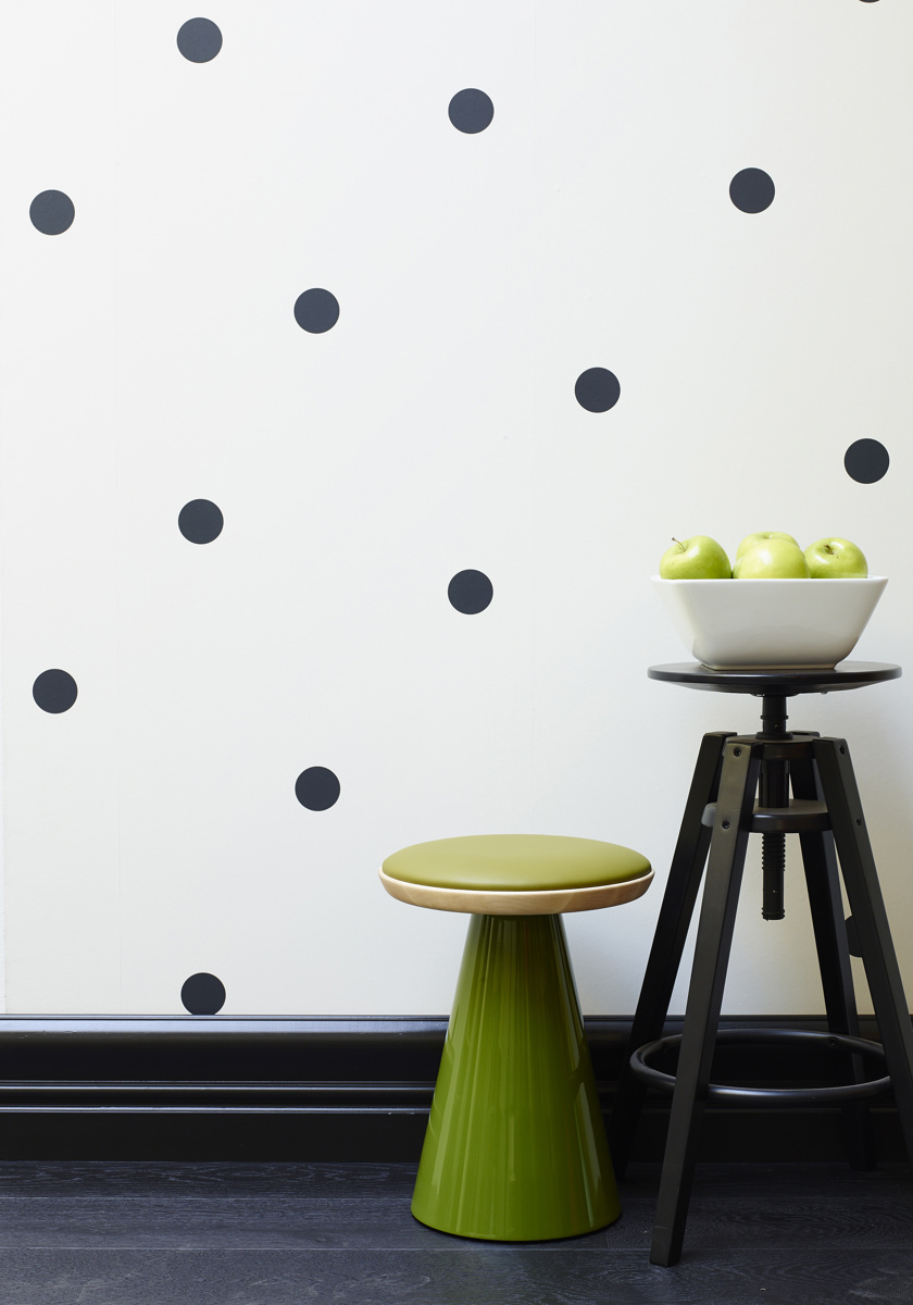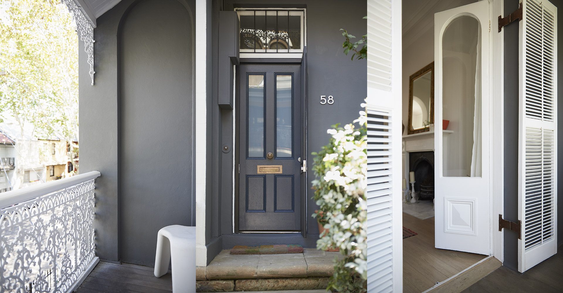 On timber and ironwork, Porter's Aqua Gloss Enamel in Alpen. On wall, Porter's Stone Paint Fine in Ramshead.
